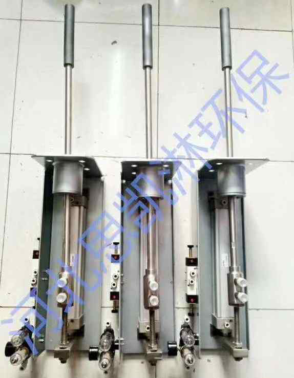 氣動脫硝噴槍主要由脫硝噴槍、支架、氣缸、油水分離器和電磁閥等部分組成。噴槍和支架均有本司工廠加工完成;氣缸、油水分離器、電磁閥均采購為亞德客品牌。
